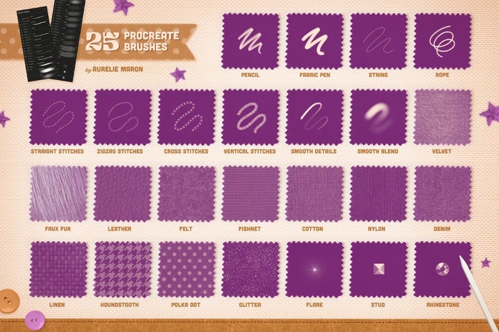 30+ Procreate Brushes – linen, denim, wool, cotton, and embroidery stitch effects