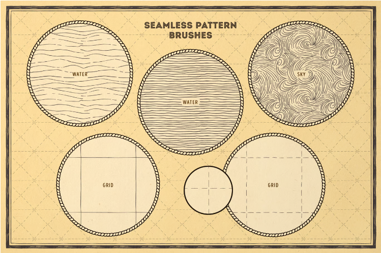 15 seamless repeat pattern brushes (water, land, sky, and atlas grid);