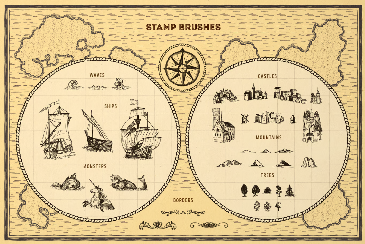 There are so many fantastical lands left undiscovered and you're about to change that! Take out your iPad and create a map to another adventuresome trip of yours or reveal everyone where the treasure is hidden. Whatever your plan is, these Procreate stamp brushes will be your instruments for achieving any artistic idea fix!